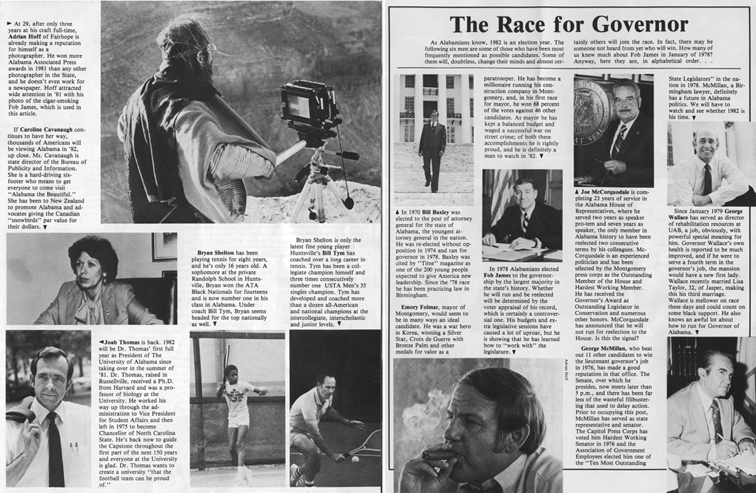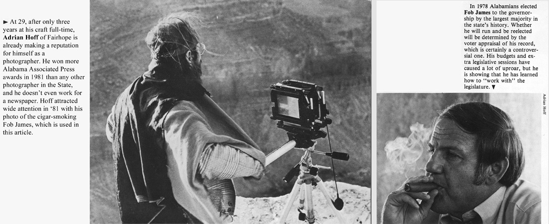 Alabama Monthly magazine, February 1982: People to Watch in '82. Publicity surrounding my strong showing at the Alabama Press Association's 1981 awards banquet probably added me to the list; the magazine received my photograph of Governor Fob James from the governor's office, after I'd been interviewed. |