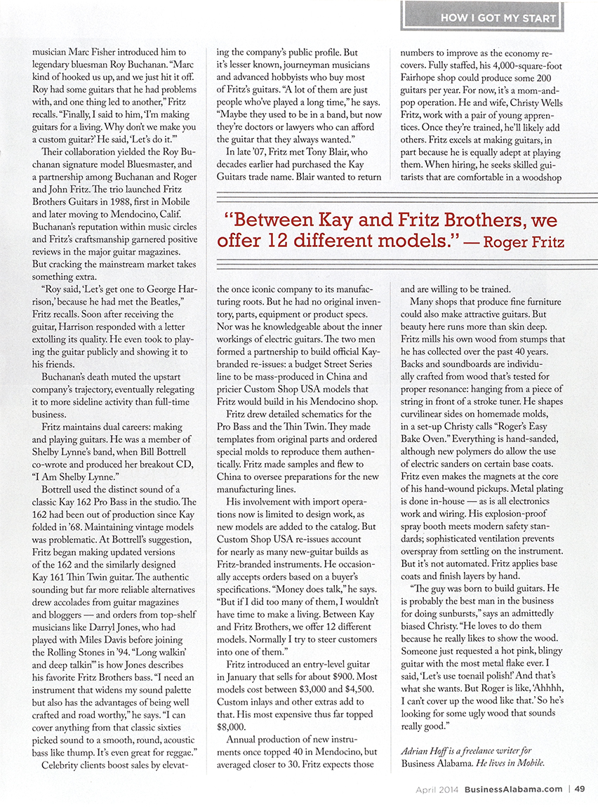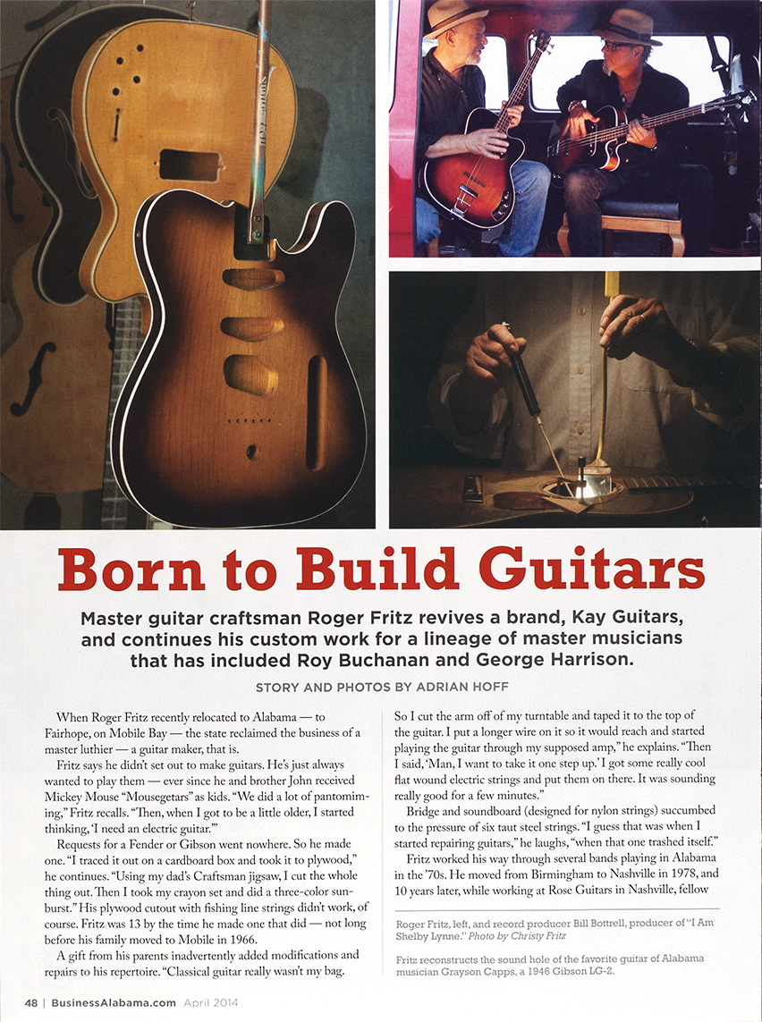 Born to Build Guitars Master guitar craftsman Roger Fritz revives a brand, Kay Guitars, and continues his custom work Business AlabamaMagazine, April 2014. Story and photos by Adrian Hoff |