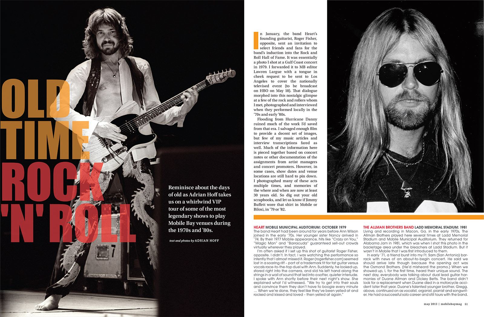 In January, Heart’s founding guitarist, Roger Fisher sent an invitation to select friends and fans for the band’s induction into the Rock and Roll Hall of Fame. It was essentially a photo I shot at a Gulf Coast concert in 1979. I forwarded it to MB editor Lawren Largue with a tongue in cheek request to be sent to Los Angeles to cover the nationally televised event (to be broadcast on HBO on May 18). That dialogue morphed into this nostalgic glimpse at a few of the rock and rollers whom I met, photographed and interviewed in the ’70s and early ’80s. |