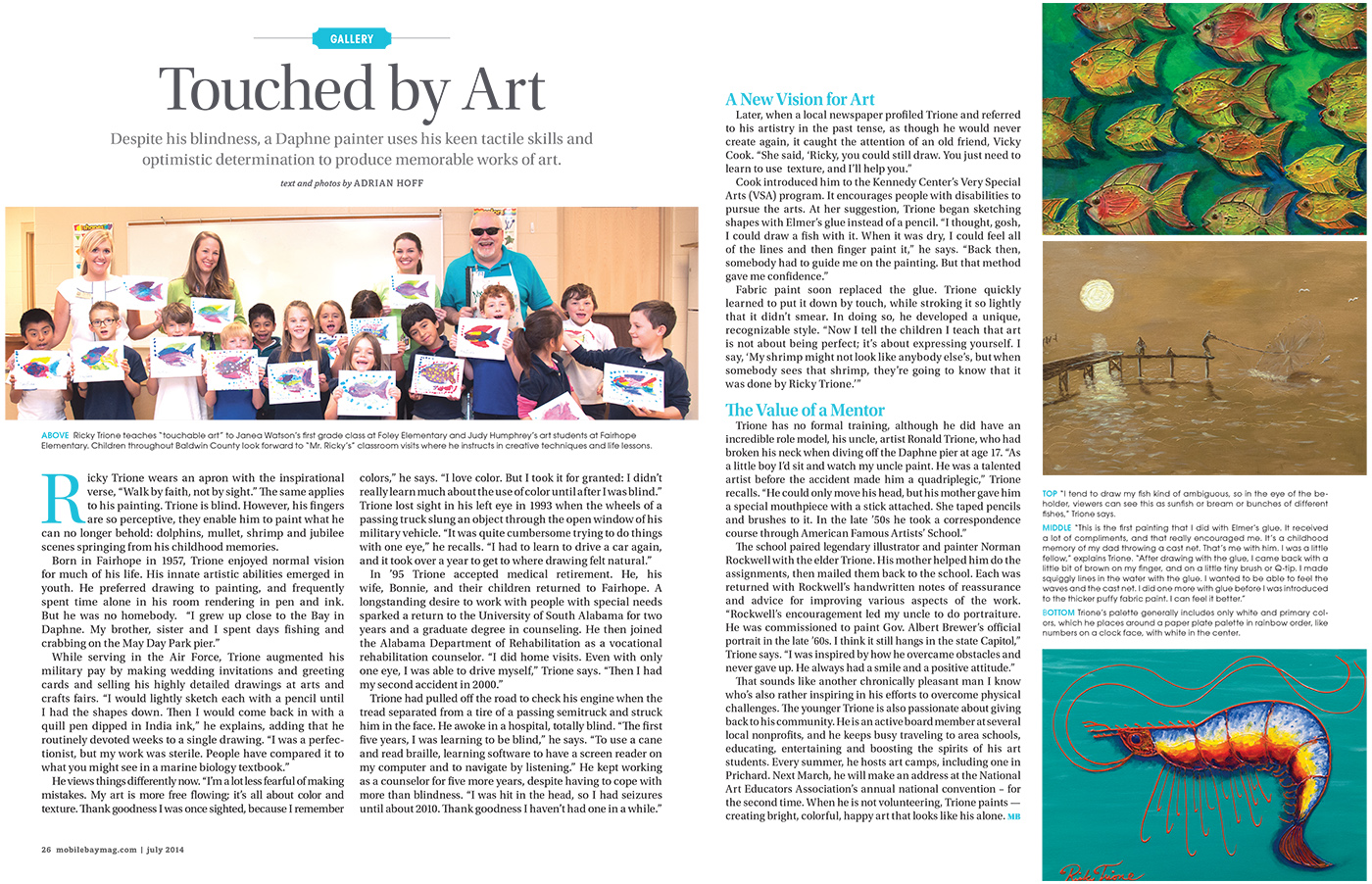 Touched by Art Despite his blindness, a Daphne painter uses his keen tactile skills and optimistic determination to produce memorable works of art. by Adrian Hoff. Mobile Bay magazine, July 2014. |