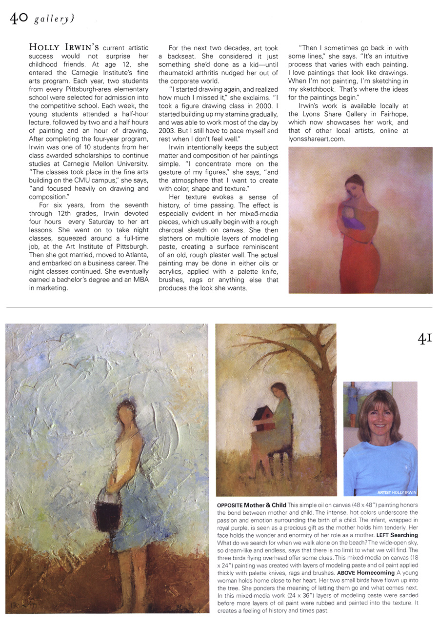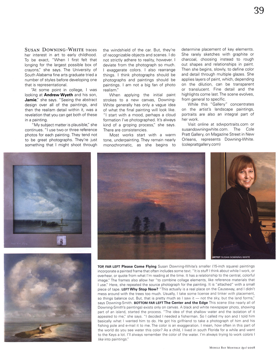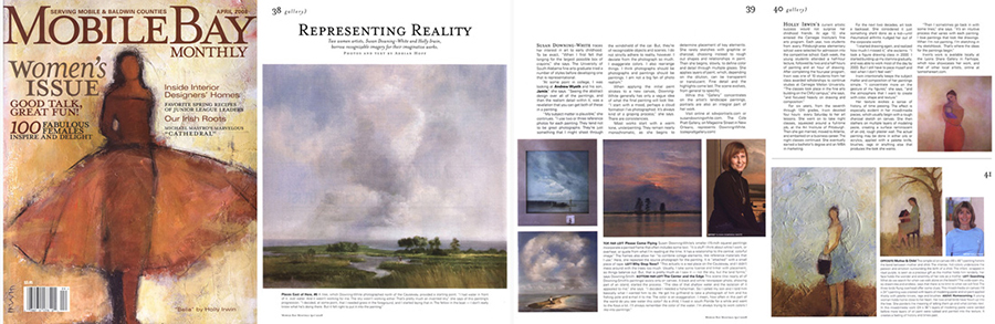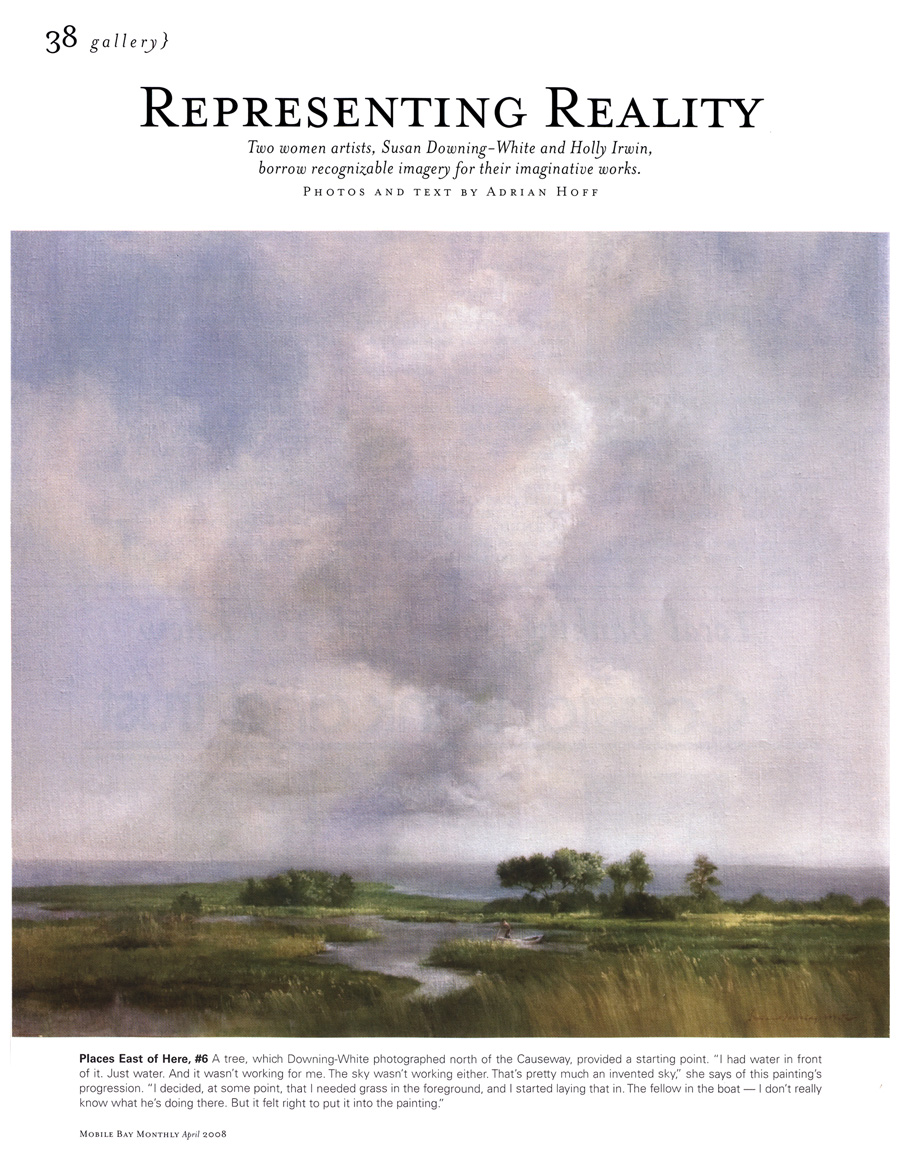 Mobile Bay Monthly magazine. April 2008 Gallery. Representing Reality: Two women artists, Susan Downing-White and Holly Irwin borrow recognizable imagery for their imaginative works. Text and photos by Adrian Hoff.