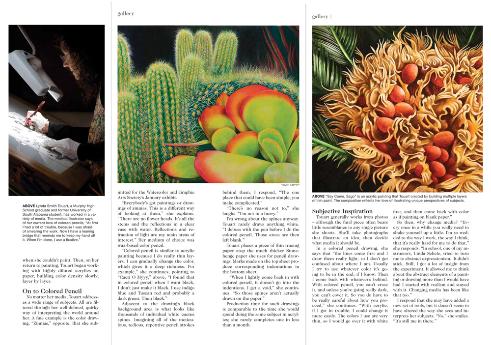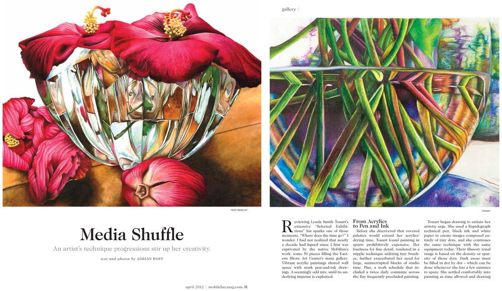 Mobile Bay Monthly magazine, April 2012. Gallery: Media Shuffle. An artist’s technique progressions stir up her creativity. Article and photos by Adrian Hoff