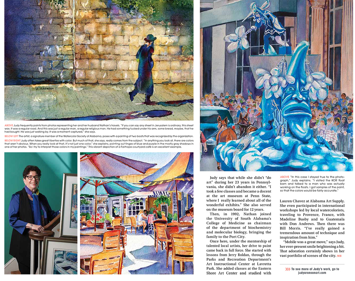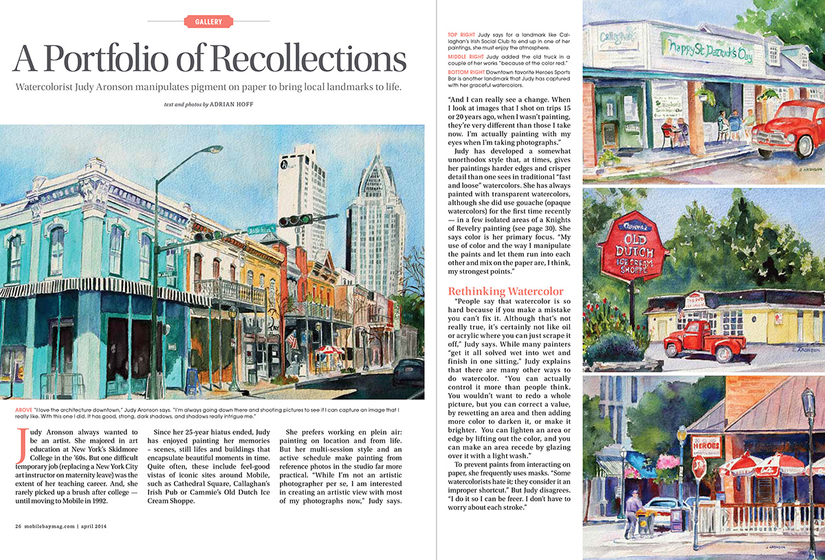 A Portfolio of Recollections Watercolorist Judy Aronson manipulates pigment on paper to bring local landmarks to life. Mobile Bay Magazine, Gallery, April 2014. Text and photos by Adrian Hoff