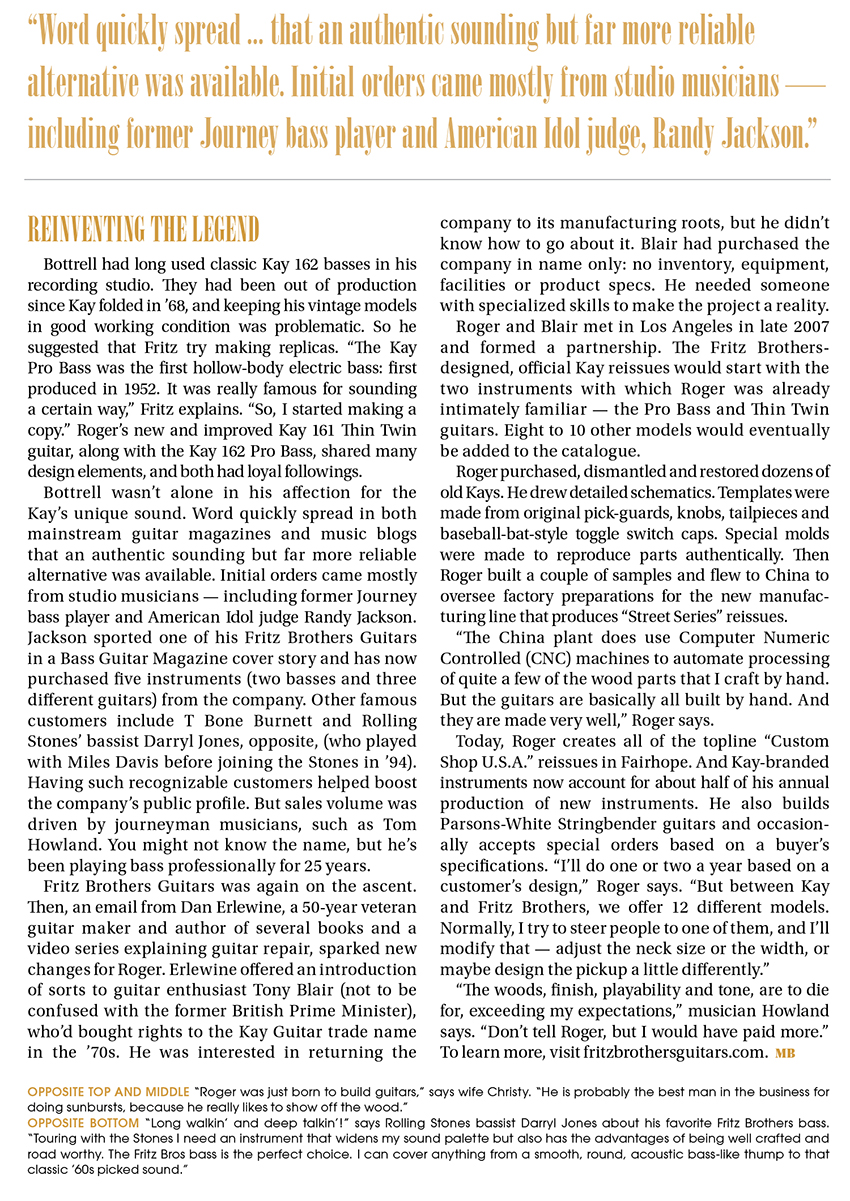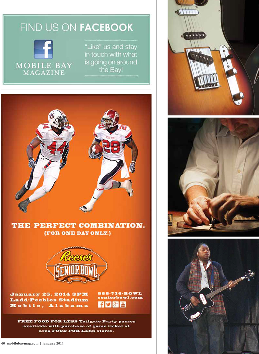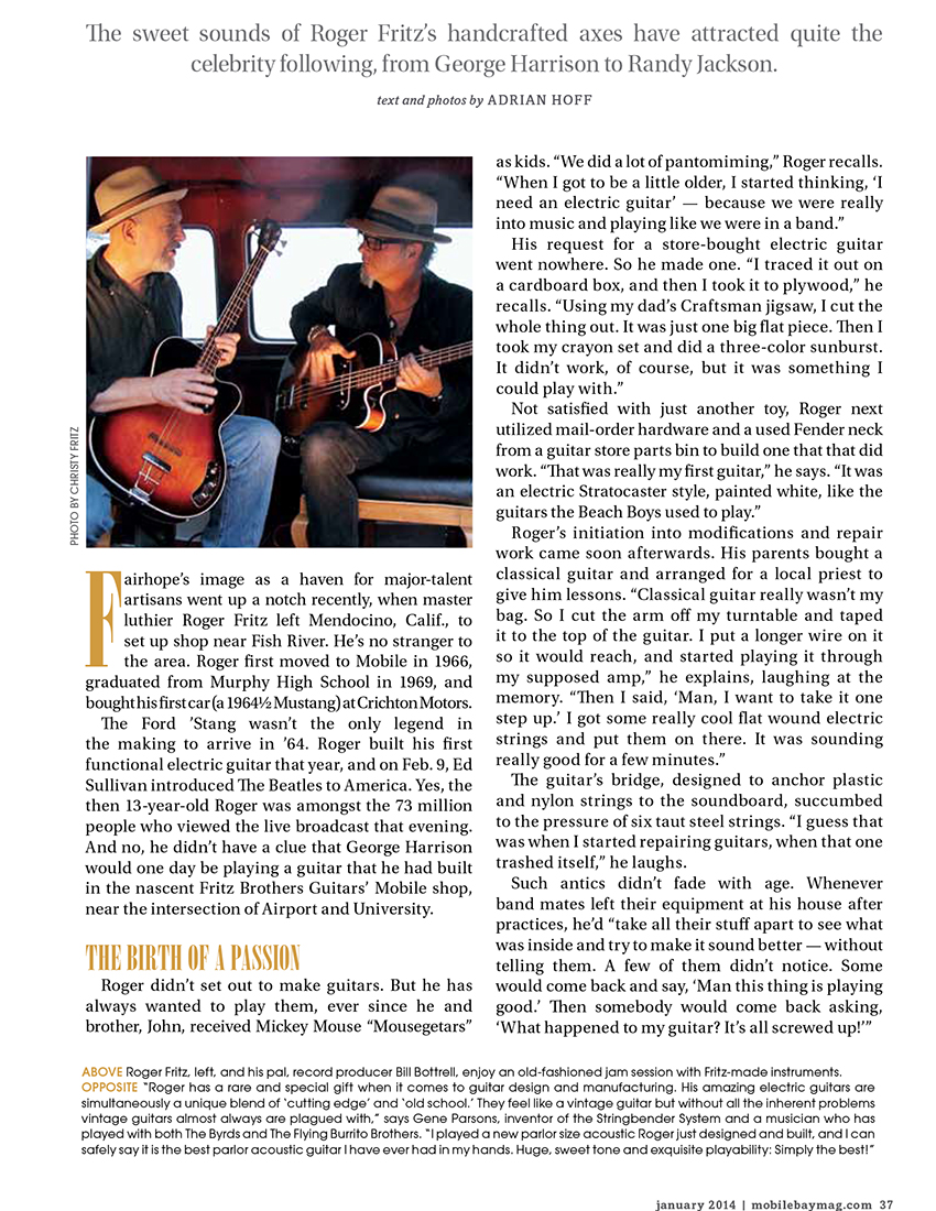 Guitar Hero: The sweet sounds of Roger Fritz’s handcrafted axes have attracted quite the celebrity following, from George Harrison to Randy Jackson. Mobile Bay Magazine, January 2014. Text and photos by Adrian Hoff |