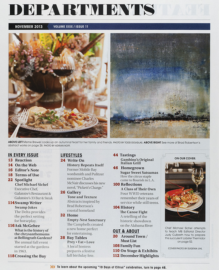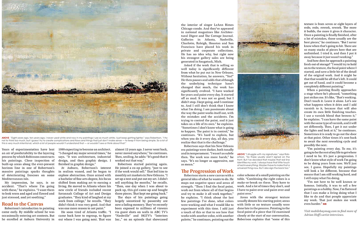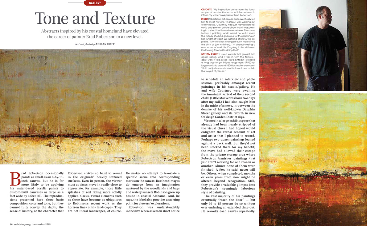 Tone and Texture Abstracts inspired by his coastal homeland have elevated the career of painter Brad Robertson to a new level. Mobile Bay Magazine, Gallery, November 2013. Text and photos by Adrian Hoff