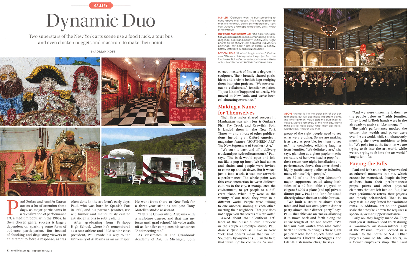 Their first major shared success in New York was with Jen & Outlaw’s Fish Fry Truck and Crawfish Boil. It landed them in the New York Times — and a host of other publications, including Oxford American magazine’s SOUTHERN ART: The New Superstars of Southern Art.