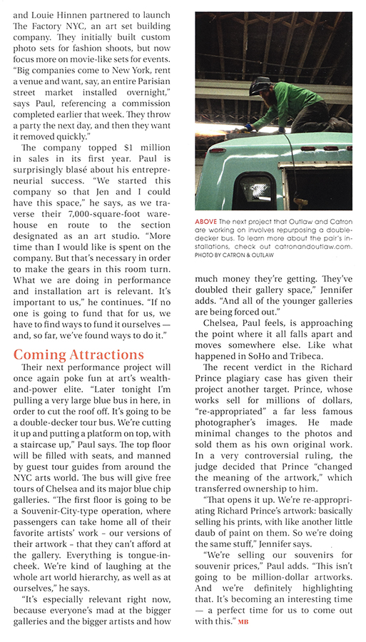 “Later tonight I’m pulling a very large blue bus in here, in order to cut the roof off of it. It’s going to be a double-decker tour bus. We’re cutting it up and putting the platform on top, with a staircase up,” Paul says, of a bus they purchased early this year. The top floor will be filled with seats, and manned by guest tour guides from around the NYC arts world. They’ll give free tours of Chelsea and its major blue chip galleries. “The first floor is going to be a Souvenir City type operation where you can take home all of your favorite artists’ artwork, that you can’t afford at the gallery — our versions of their artwork. Everything is tongue-in-cheek.  We’re kind of laughing at the whole art world hierarchy, as well as poke fun at ourselves,” he says.